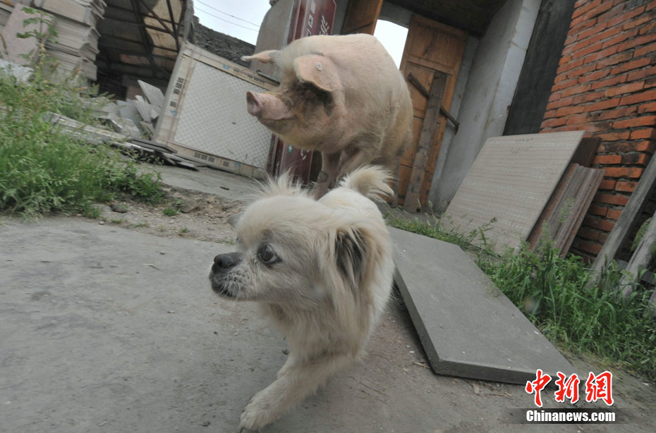 5月8日,四川省大邑建川博物館護養的“5.12汶川大地震”著名抗震動物豬堅強,目前為腿部后遺傷病動過手術后,正在專設的動物醫療所度過休養半年的病假生活之中。圖為豬堅強和小狗作伴。(賈國榮 攝)