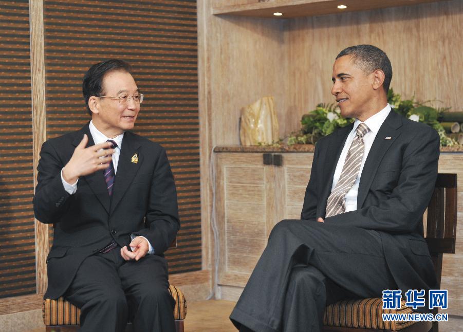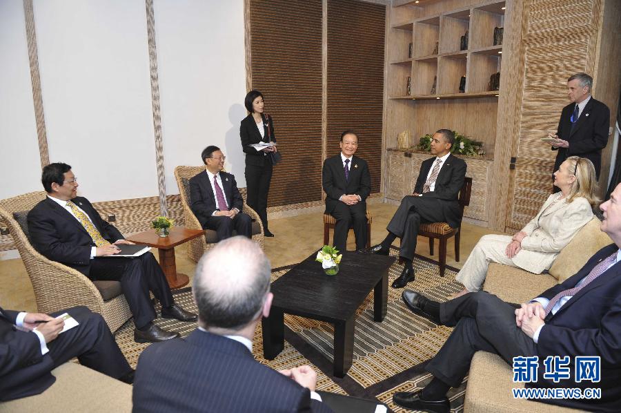 11月19日,中國國務院總理溫家寶在印度尼西亞巴厘島會見美國總統奧巴馬。 新華社記者王曄攝