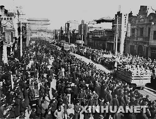 資料圖片:1949年1月31日舉行北平入城式。人民解放軍在萬眾歡呼中進入前門大街。新華社發
