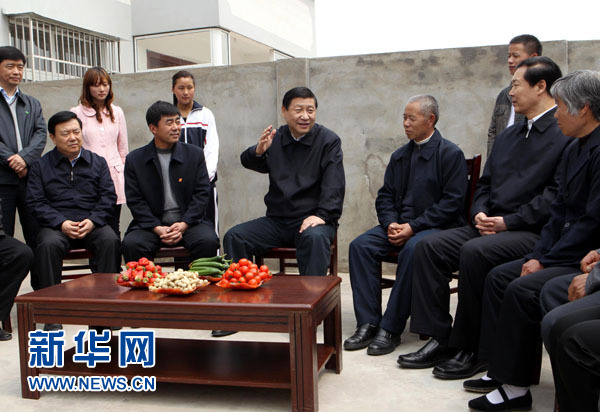 安徽是農業大省,安徽小崗村是我國農村聯產承包責任制的發源地。習近平對安徽農村改革發展十分關心,8日上午一下飛機就來到阜陽市潁州區西湖景區街道白行村。他認真察看村黨務公開欄、村務公開欄和農家書屋、村衛生室,仔細詢問這里發展經濟、服務群眾、推進新農村建設的情況,對他們取得的成績給予充分肯定。在村民倪澤民的院子里,習近平同聞訊而來的鄉親們圍坐在一起拉家常。他指出,推進農村改革發展和新農村建設,要深入貫徹科學發展觀,體現以人為本理念,千方百計增加農民收入。太和縣舊縣鎮張槐村頭,綠油油的萬畝小麥一望無際。習近平走進田間,拿起麥苗仔細察看長勢,詢問機井的水位,與全國勞動模范、種植大戶徐淙祥以及正在忙農活的村民親切交談。得知老徐管理的這片地去年畝產達到700多公斤、比平均畝產高出200多公斤,習近平十分高興,鼓勵他繼續攻關小麥高產關鍵技術,為國家糧食生產多做貢獻。