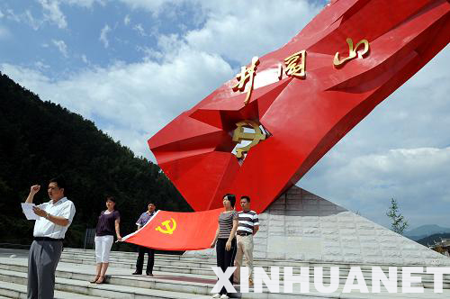 6月30日,江西省井岡山市廈坪鎮基層黨員干部在井岡紅旗雕塑下宣誓,重溫入黨誓詞。“七一”來臨之際,前來江西井岡山祭奠革命先烈的黨員干部絡繹不絕。他們重溫入黨誓詞,學習井岡山精神,迎接黨的89歲生日。新華社記者 馬平攝