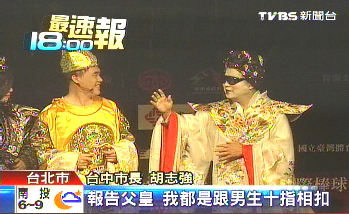 胡志強(qiáng)在臺(tái)上對扮演皇帝的郝龍斌說:“報(bào)告父皇,我都是跟男生十指相扣,跟你一樣,你也專門跟男人十指相扣。”扮演妹妹的陳文茜也在旁邊起哄,一起調(diào)侃郝龍斌日前和馬英九十指緊扣的牽手畫面。被搞笑攻擊的郝龍斌顯然招架不住,還一度接不上臺(tái)詞。(陳佳慧)