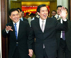 馬英九和臺(tái)北市長郝龍斌近日參加臺(tái)軍退役將領(lǐng)春節(jié)聯(lián)誼餐會(huì),把酒言歡后手牽手走出“勝利廳”。圖片來源:臺(tái)灣《聯(lián)合報(bào)》