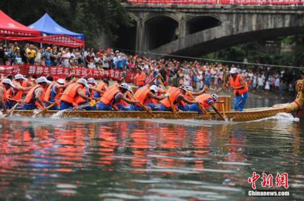 2016年6月9日,農歷五月初五端午節(jié),極具中華傳統(tǒng)文化魅力的賽龍舟在貴州省岑鞏縣龍?zhí)镦?zhèn)舉行,共度端午節(jié)。中新社記者賀俊怡攝