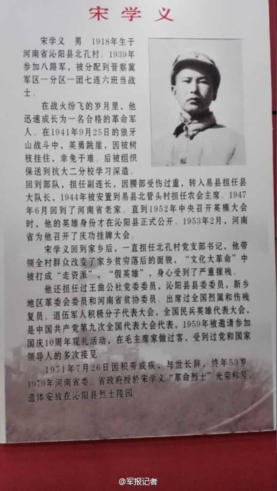 72 歲的北管頭村村民楊成海現(xiàn)在還擔(dān)任狼牙山景區(qū)義務(wù)宣講員。領(lǐng)我們?nèi)ニ螌W(xué)義侄子家的路上,他說(shuō)到: “‘ 狼牙山五壯士 ’ 之一的宋壯士腰有傷,是個(gè)很樸實(shí)的人。 1944 年退伍后,他來(lái)到北管頭村做了上門女婿。 1970 年,宋學(xué)義到我家串門時(shí),我反復(fù)做工作,他才勉強(qiáng)同意講起當(dāng)年的事。 ”