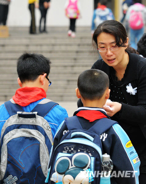 3月24日,福建南平實驗小學教師在學校門口維持秩序迎接學生。新華社記者 魏培全攝