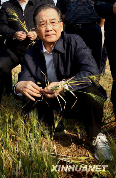 這是3月19日,溫家寶來到陸良縣芳華鎮獅子口村萬畝大麥示范田,實地察看農作物受災情況。 新華社記者 姚大偉 攝