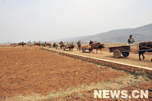 3月23日,云南省宣威市熱水鎮營溝村的村民趕著牛車到村里的水源點取水。新華社 記者 何俊昌攝