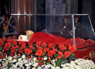 | 朝鮮國家電視臺28日上午播放的畫面顯示,平壤錦繡山紀念宮內,金正日靈柩周圍擺放一圈名為“金正日花”的海棠花。金正日安睡在靈柩內,身穿他生前最常穿的夾克服,身上覆蓋一面紅旗。 |