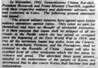 | 在二戰反法西斯同盟取得決定性勝利的時刻,中、美、英三國首腦蔣介石、羅斯福、丘吉爾于1943年11月22日至26日在開羅舉行會議,討論如何協調對日作戰的共同軍事問題和戰后如何處置日本等政治問題,史稱“開羅會議”。1943年12月1日,中美英三國在重慶、華盛頓、倫敦三地同時發表《開羅宣言》。