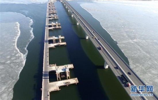這是2017年2月14日航拍的橫跨官廳水庫的京張高鐵特大橋(左)與京張高速公路特大橋。京張高鐵是北京冬奧會交通配套工程。 新華社發(武殿森 攝)