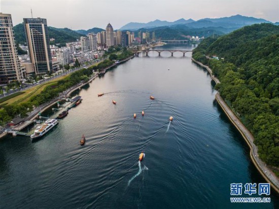 2018年7月23日,游客乘船在新安江浙江建德段江面上游玩(無人機拍攝)。 新華社記者 徐昱 攝