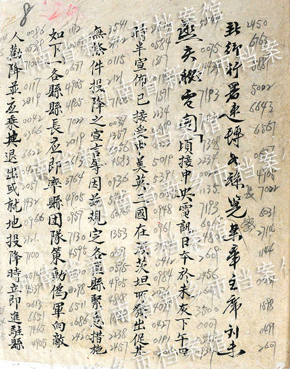 圖為1945年,河南新鄉關于日本投降后指示各區縣部署緊急措施電報稿。【央視網據中央檔案館資料】