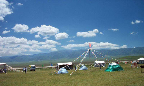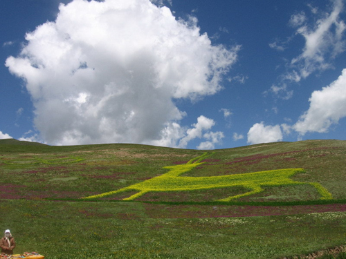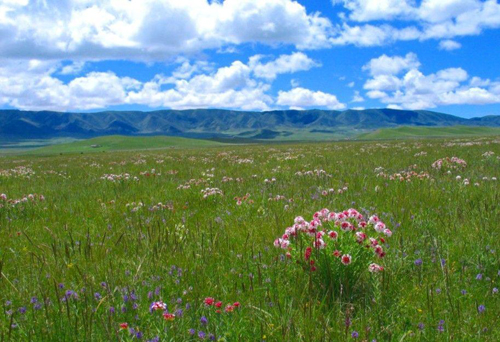 這里很美,美得足以讓你震顫;這里很高,高得讓你感覺藍天和白云伸手可及;這里是一片碧草如茵的大草原。草原的天,藍得醉人;草原的云,白得可心;草原的山,美得如畫,就連草原的空氣也甜得讓人心怡。浮云般的羊群,棕黑相間的牦牛,星星點點地徜徉在青草和野花叢中。不時有穿著藏服的藏民,騎著駿馬悠然地在草原上緩緩而來。遠處,山巒起伏,偶有雄鷹飛過的身影,蓮花般的蒙古包散落在白云深處。