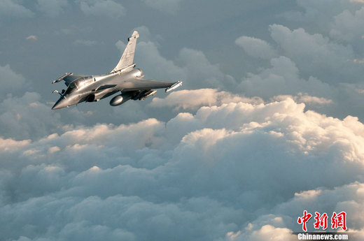 當地時間3月19日,一架法國陣風戰機攻擊利比亞期間接近一架空中加油機進行加油作業。