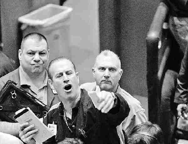 紐約商品交易所大廳內(nèi),原油期貨交易員表情豐富。(路透社)