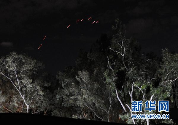 這是3月22日晚在利比亞首都的黎波里拍攝的橘紅色的防空炮火。的黎波里市區當地時間22日晚8時30分(北京時間23日凌晨2時30分)左右,又響起密集的防空炮聲,人們可看到橘紅色的防空炮火射向天空。 新華社記者 楊光 攝