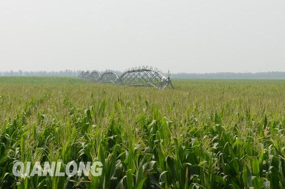 圖為五里明鎮整鎮推進規模經營暨玉米大壟種植示范區長勢喜人的玉米,遠處為大型節能噴灌設施。(千龍網滕祖敏 攝)
