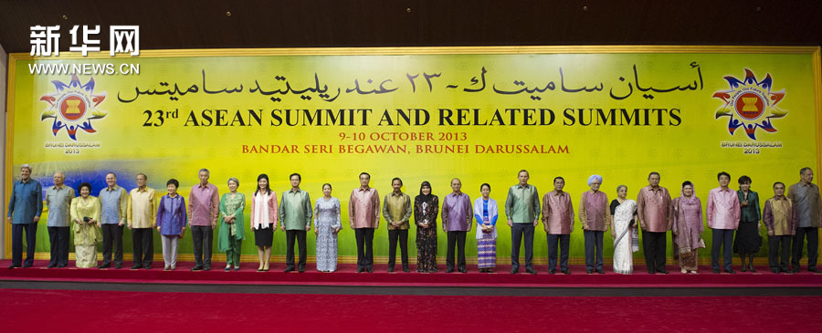 10月9日,中國(guó)國(guó)務(wù)院總理李克強(qiáng)在文萊斯里巴加灣市出席文萊蘇丹哈桑納爾為出席東亞峰會(huì)的領(lǐng)導(dǎo)人舉行的歡迎宴會(huì)。這是與會(huì)領(lǐng)導(dǎo)人等在宴會(huì)前身著民族服裝合影。新華社記者黃敬文攝