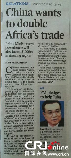 《商業日報》在6日的報道中則著重關注了“中國總理表示將增加1萬億先令援助非洲”的內容。1萬億肯尼亞先令大約相當于120億美元,這是該報將李克強總理在非盟演講中提到的“中國決定向非洲國家增加100億美元貸款額度,同時為中非發展基金增資20億美元”的一種換算。報道說,中方還要在非洲設立高速鐵路研發中心。