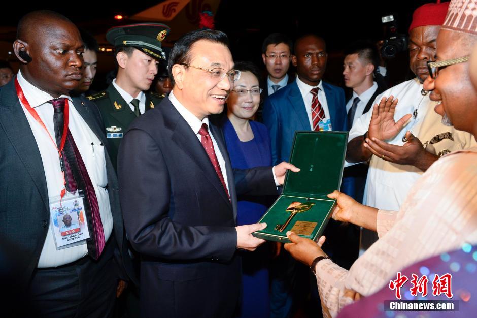當地時間5月6日晚,應尼日利亞總統喬納森邀請,國務院總理李克強乘專機抵達阿布賈國際機場,開始對尼日利亞進行正式訪問。李克強總理夫人程虹同機抵達。尼外交部長、勞工部長到機場迎接,聯邦首都區部長按照接待尊貴客人的傳統禮儀,向李克強贈送了阿布賈城市鑰匙,熱烈歡迎中國總理到訪。中新社記者 劉震 攝