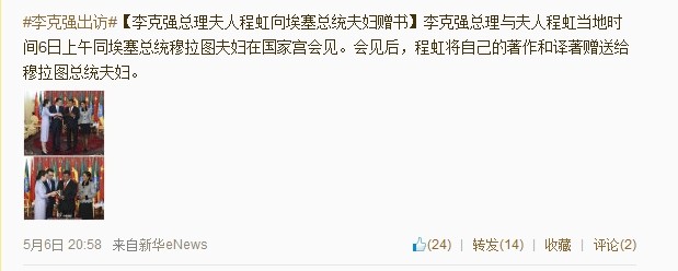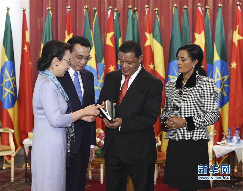 5月6日,中國國務(wù)院總理李克強(qiáng)在亞的斯亞貝巴國家宮會見埃塞俄比亞總統(tǒng)穆拉圖。 李克強(qiáng)總理夫人程虹、穆拉圖總統(tǒng)夫人梅阿扎參加會見。這是會見結(jié)束后,李克強(qiáng)總理夫人程虹向穆拉圖總統(tǒng)夫婦贈送她的著作。 新華社記者李學(xué)仁攝"