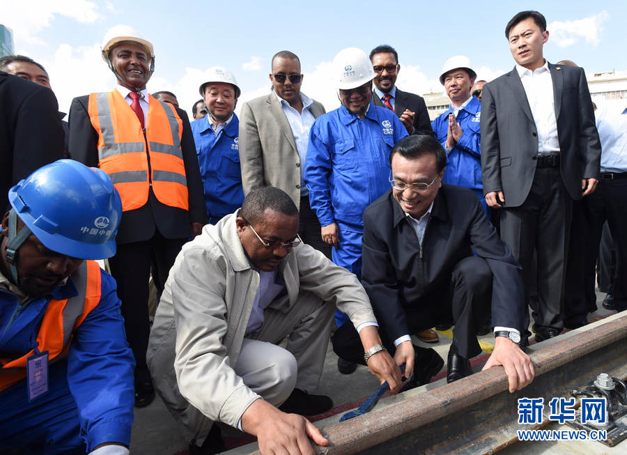 5月5日,國務院總理李克強考察亞的斯亞貝巴輕軌項目,埃塞俄比亞總理海爾馬里亞姆陪同。看到中埃雙方員工正在鋪軌作業,李克強同海爾馬里亞姆一起拿起扳手,擰緊螺絲。新華社記者李學仁攝