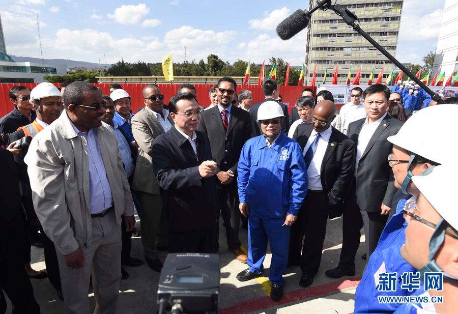 5月5日,中國國務院總理李克強考察亞的斯亞貝巴輕軌項目,埃塞俄比亞總理海爾馬里亞姆陪同。這是李克強與海爾馬里亞姆看望施工人員。新華社記者李學仁攝