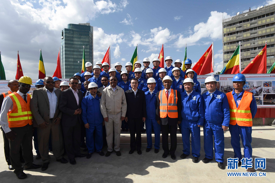 5月5日,中國國務院總理李克強考察亞的斯亞貝巴輕軌項目,埃塞俄比亞總理海爾馬里亞姆陪同。這是李克強同海爾馬里亞姆與施工人員合影留念。新華社記者李學仁攝
