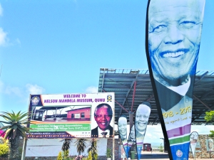 15日,在曼德拉故鄉(xiāng)古努村,媒體區(qū)入口處的紀(jì)念墻上掛著曼德拉頭像。 (本報記者邢磊攝)