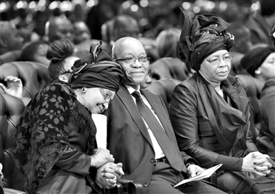 曼德拉前妻溫妮(左)、南非總統(tǒng)祖馬(中)和曼德拉遺孀格拉薩(右)出席曼德拉葬禮儀式。