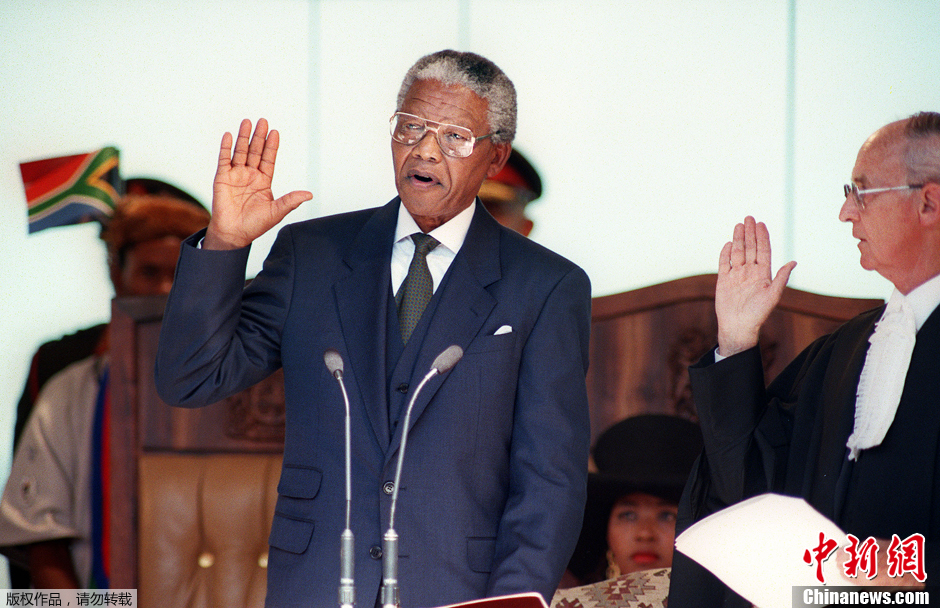 1994年5月9日,在南非首次不分種族大選結果揭曉后,曼德拉成為南非歷史上首位黑人總統。1999年6月曼德拉正式去職。圖為1994年5月10日,南非比勒陀利亞,曼德拉當選總統后在聯合大廈發表就職演說。