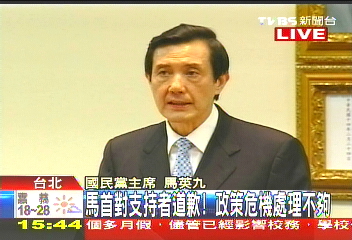 國民黨中常會(huì)檢討“三合一”選舉,黨主席馬英九兩度致歉。來源:臺灣TVBS電視臺