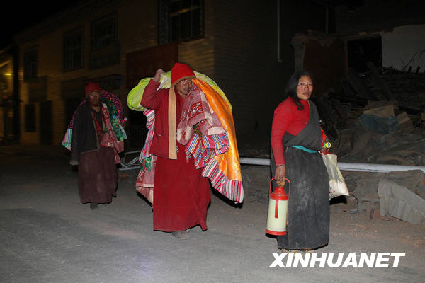 4月14日深夜,青海玉樹地震災區受災群眾扛著鋪蓋向安全的地方轉移。當日7時49分,青海省玉樹藏族自治州玉樹縣發生7.1級地震,給當地人民群眾生命財產造成嚴重損失。 新華社記者 邢廣利 攝