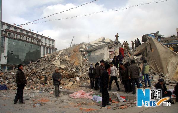 這是青海玉樹(shù)地震災(zāi)區(qū)倒塌的房屋(4月14日攝)。青海玉樹(shù)地震災(zāi)區(qū)受災(zāi)嚴(yán)重,結(jié)古鎮(zhèn)土木結(jié)構(gòu)的房屋幾乎全部倒塌。4月14日7時(shí)49分,青海省玉樹(shù)藏族自治州玉樹(shù)縣發(fā)生7.1級(jí)地震,給當(dāng)?shù)厝嗣袢罕娚?cái)產(chǎn)造成嚴(yán)重?fù)p失。 新華社記者 任曉剛 攝