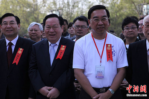 4月22日,北京清華大學(xué)校長顧秉林(左二)與臺灣新竹清華大學(xué)副校長葉銘泉(左三)共同出席北京清華大學(xué)新清華學(xué)堂揭幕儀式。4月24日是清華大學(xué)百年校慶紀(jì)念日,兩地清華大學(xué)將共同慶祝百年華誕,并各派副校長帶隊前往參加慶典。中新社發(fā) 蘇丹 攝