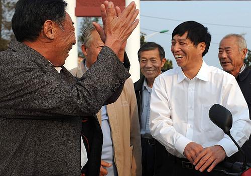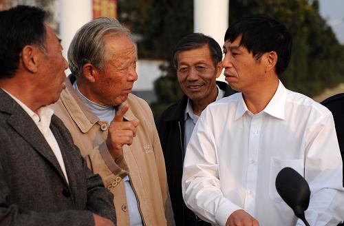 這是2008年10月7日,小崗村新帶頭人、村黨委書記沈浩(前右)與大包干帶頭人關友江、嚴俊昌、嚴金昌、嚴學昌交流小崗村的改革發展情況。新華社記者 王雷 攝