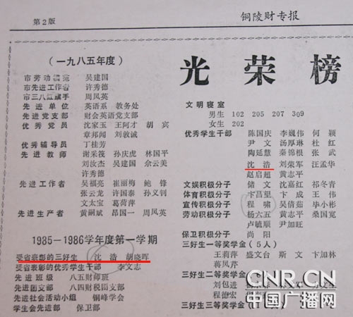 沈浩在上學期間所取得的成績,當時已經改名。(中廣網 陳曉冉攝)