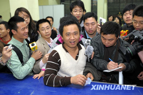 1月21日,廣州流花展館春運火車票集中售取票點迎來第一位取實名制火車票的旅客,外來務工人員李建剛(前中)和他表弟劉超當天一早通過電話訂到廣州至資陽的火車票。(圖片來源:新華社 劉大偉 攝)