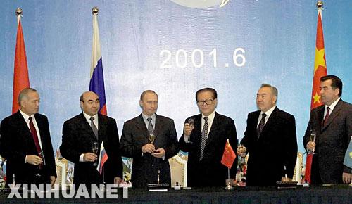 這是2001年6月15日,上海合作組織首次元首會議在上海舉行,出席《上海合作組織成立宣言》和《打擊恐怖主義、分裂主義和極端主義上海公約》簽字儀式的與會國元首簽字后舉杯慶賀。 新華社發