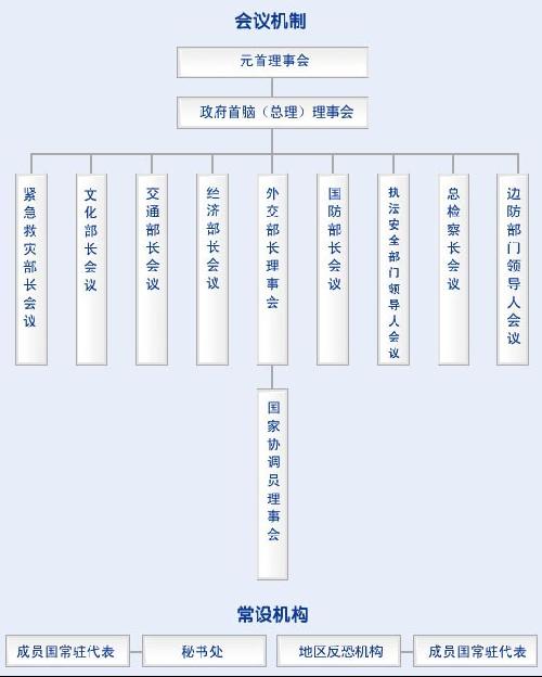 ● 成員國政府首腦(總理)理事會——每年舉行一次例會,重點研究組織框架內多邊合作的戰略與優先方向,解決經濟合作等領域的原則和迫切問題,并批準組織年度預算。