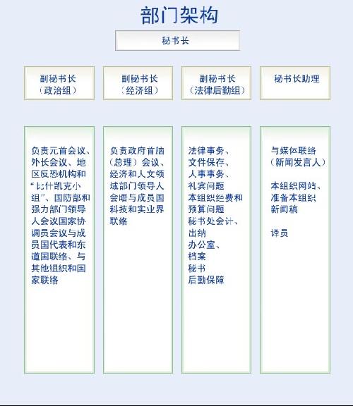 ●秘書處——上海合作組織常設行政機構,設在北京,2004年1月成立。主要職能是:為組織活動提供組織、技術保障;參與組織各機構文件的研究和落實;就編制組織年度預算提出建議。秘書長由元首會議任命,由各成員國按國名的俄文字母順序輪流擔任,任期三年,不得連任。首任秘書長為張德廣。現任秘書長為哈薩克斯坦的博拉特·努爾加利耶夫,2007年1月1日就任。