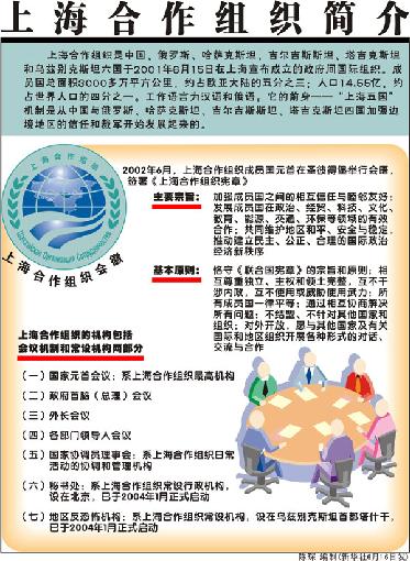 ● 2001年6月14日,“上海五國”元首在上海舉行第6次會晤,烏茲別克斯坦以完全平等的身份加入“上海五國”。15日,6國元首舉行了首次會晤,并簽署了《上海合作組織成立宣言》,宣告上海合作組織正式成立。