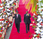 | 3月26日,南非總統祖馬在比勒陀利亞聯邦大廈前廣場舉行儀式,歡迎中國國家主席習近平訪問南非。這是習近平和夫人彭麗媛同祖馬和夫人一起步入廣場。 |