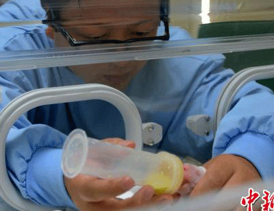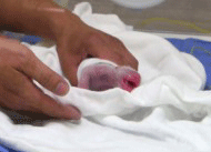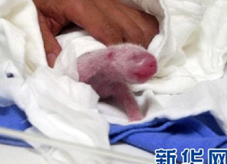 | 昨天一早,臺(tái)北動(dòng)物園就在大熊貓館內(nèi)貼出告示:“圓圓于7月6日20時(shí)05分產(chǎn)仔(崽),圓圓做(坐)月子即日起停展,敬請(qǐng)來(lái)賓見(jiàn)諒與祝福!倍鴱呐_(tái)北動(dòng)物園已經(jīng)公布的影片看,熊貓幼崽全身呈肉粉色,沒(méi)有耳朵,眼睛的部位也只是一個(gè)黑點(diǎn)兒?傮w長(zhǎng)21.3厘米、183.4克重的雌性熊貓幼崽,看起來(lái)十分嬌小,外形類(lèi)似剛出生的兔子。