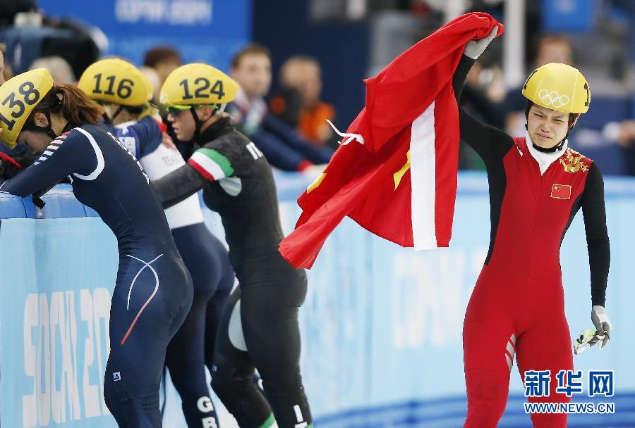 2月13日,中國選手李堅柔(右)在比賽后慶祝。當日,在2014索契冬奧會短道速滑女子500米決賽中,中國選手李堅柔以45秒263的成績獲得冠軍,為中國體育代表團獲得本屆冬奧會首金。新華社記者王麗莉攝