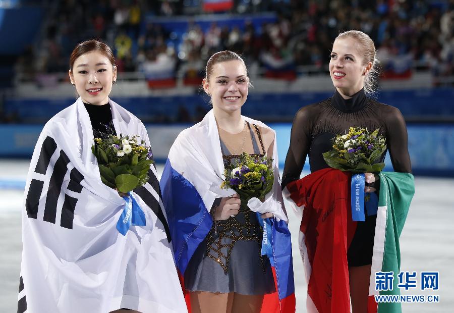 2月20日,冠軍俄羅斯選手斯托尼科娃(中)、亞軍韓國選手金妍兒(左)和季軍意大利選手科斯特納在獻花儀式后合影。當日,在2014年索契冬奧會花樣滑冰女子單人滑比賽中,俄羅斯選手斯托尼科娃以224.59分的成績奪得冠軍。新華社記者王麗莉攝