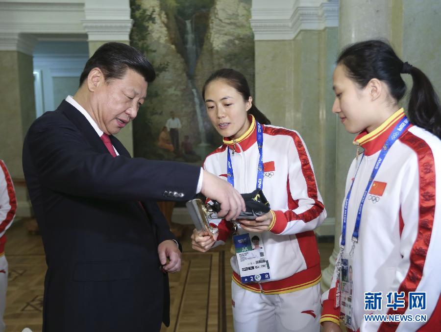 2月7日,中共中央總書記、國家主席、中央軍委主席習近平在俄羅斯索契親切看望參加第二十二屆冬季奧林匹克運動會的中國體育代表團。這是運動員向習近平介紹冰雪運動器材。新華社記者 蘭紅光 攝