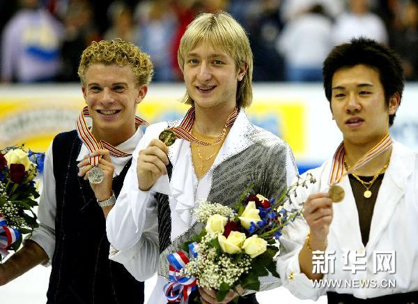 圖為獲得在美國華盛頓舉行的花樣滑冰世錦賽男子單人滑冠軍的普魯申科(中)在頒獎儀式上(2003年3月27日攝)。 新華社發