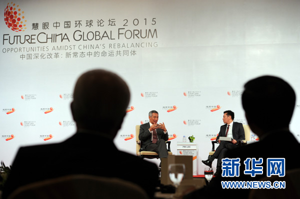 7月21日,新加坡總理李顯龍(左)和新加坡《聯合早報》總編輯吳新迪出席在新加坡舉行的“慧眼中國環球論壇”2015年年會閉幕午宴暨對話會。新華社發(鄧智煒攝)